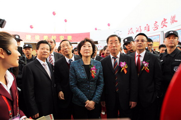 安徽省旅游局局長胡學凡陪同副省長花建慧參觀安徽旅游商品展示交易總匯