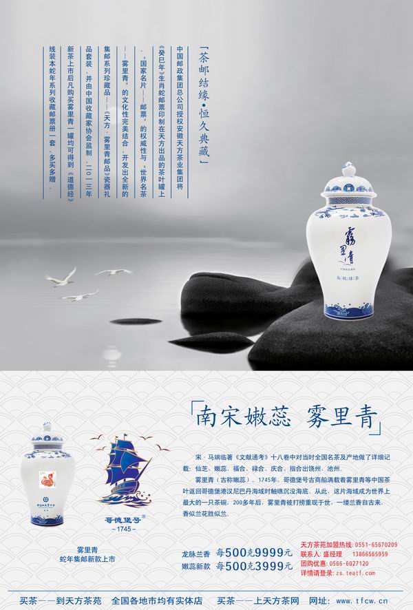 中國郵政集團(tuán)總公司授權(quán)安徽天方茶業(yè)集團(tuán)將《癸巳年》生肖蛇郵票印制在天方出品的茶葉罐上。“國家名片——郵票”的權(quán)威性與“世界名茶——霧里青”的文化性完美結(jié)合,開發(fā)出全新的集郵系列珍藏品——《天方 霧里青郵品》瓷器禮品套裝,并由中國收藏家協(xié)會(huì)監(jiān)制。