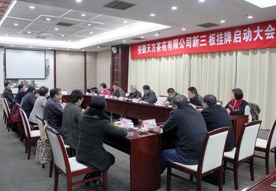 11月29日下午,安徽天方茶苑有限公司舉行“新三板”掛牌啟動會議,這標志著公司“新三板”掛牌上市工作正式啟動。池州市市長趙馨群應邀出席會議,市政府秘書長程國清主持會議,市直相關單位及相關金融機構(gòu)負責人參加會議。