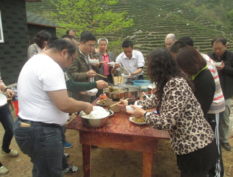 4月6日,復(fù)旦大學(xué)校友一行在天方相關(guān)負(fù)責(zé)人的帶領(lǐng)下,參觀了天方大山茶園基地。茶園邊,各種顏色的杜鵑花引得他們爭相拍照留念。山頂上,天方工作人員精心為他們準(zhǔn)備了竹筍燒腌菜、干豆角燒肉、茶葉炒雞蛋等極具地方特色的農(nóng)家菜。開飯時(shí)間,復(fù)旦大學(xué)校友們都贊不絕口:這飯菜太香了,實(shí)在是不虛此行!