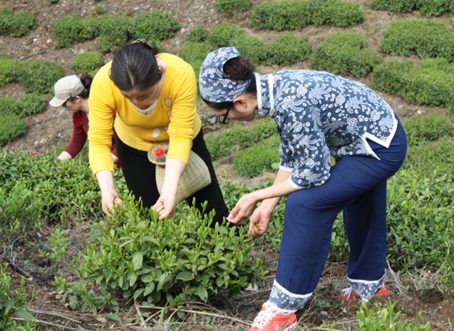 (部分客人第一次采茶,天方工作人員教他們該如何采)