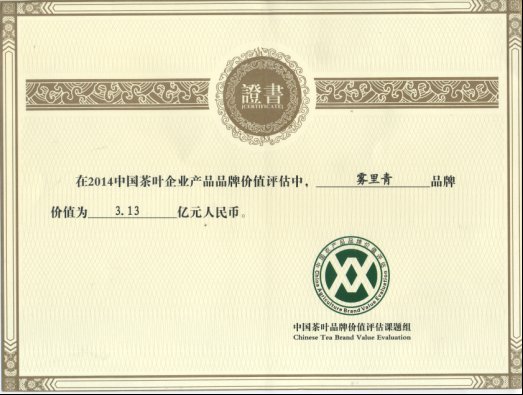 “天方”、“霧里青”獲頒中國茶葉品牌價值評估證書