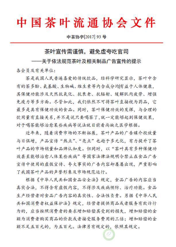 關(guān)于依法規(guī)范茶葉及相關(guān)制品廣告宣傳的提示