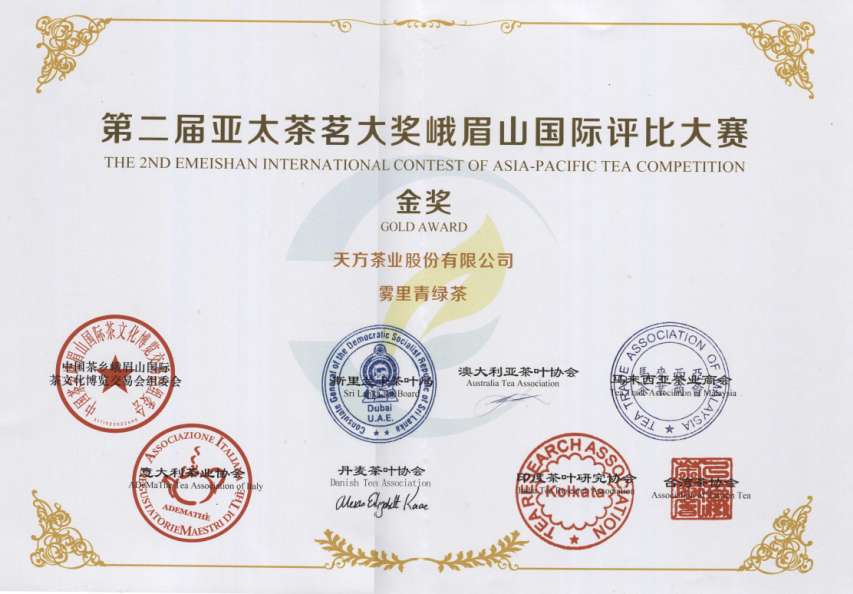 12位中外茶葉專家一起對(duì)綠茶、紅茶、烏龍茶、黑茶、黃茶、白茶、再生茶和代用茶共計(jì)167個(gè)茶樣進(jìn)行了專業(yè)的感官評(píng)審。經(jīng)過幾輪審評(píng),從干茶外形、湯色、滋味、香氣、葉底等幾項(xiàng)綜合評(píng)比后,天方茶業(yè)股份有限公司選送的霧里青綠茶喜獲金獎(jiǎng)。