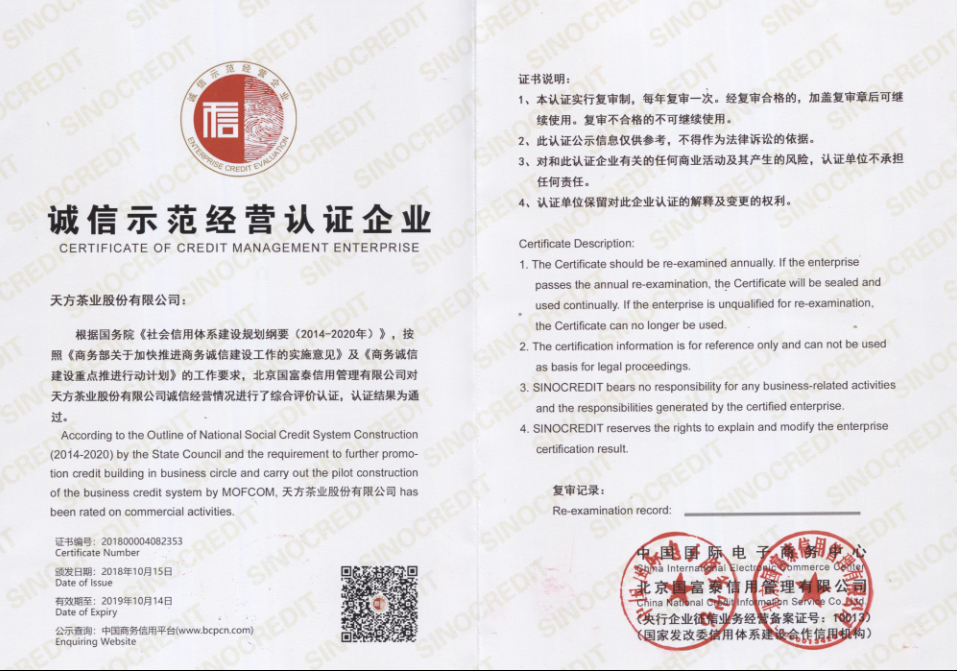 10月26日,在第七屆全國(guó)商務(wù)誠(chéng)信建設(shè)大會(huì)上,憑借優(yōu)秀的企業(yè)誠(chéng)信體系建設(shè)、支持國(guó)家商務(wù)誠(chéng)信建設(shè),以及良好的履行企業(yè)經(jīng)濟(jì)、環(huán)境和社會(huì)責(zé)任,天方茶業(yè)股份有限公司被授予誠(chéng)信示范經(jīng)營(yíng)認(rèn)證企業(yè)稱(chēng)號(hào)。