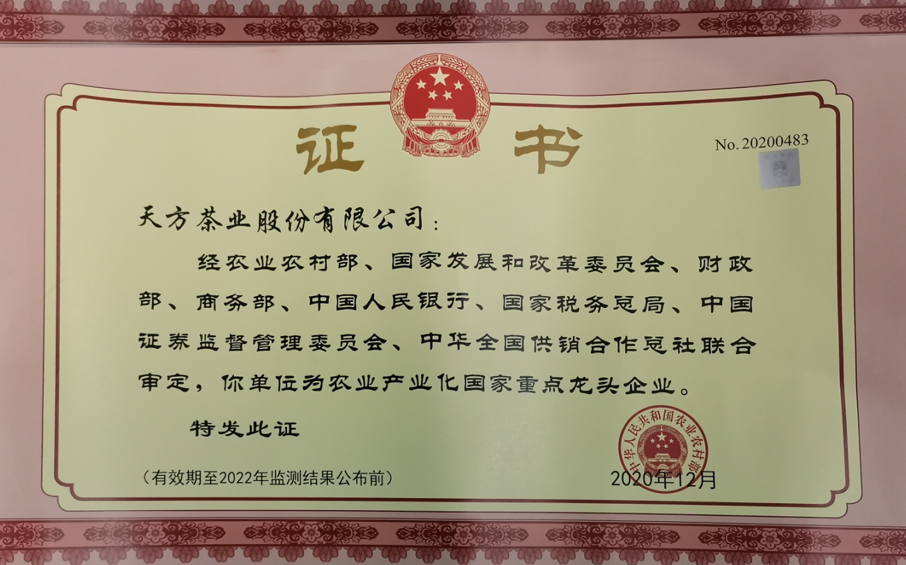 近日,農(nóng)業(yè)農(nóng)村部公布了第九次監(jiān)測(cè)合格農(nóng)業(yè)產(chǎn)業(yè)化國家重點(diǎn)龍頭企業(yè)名單的通知,天方茶業(yè)股份有限公司再一次通過監(jiān)測(cè),名列合格榜單之中,這是天方繼2011年申報(bào)成為農(nóng)業(yè)產(chǎn)業(yè)化國家重點(diǎn)龍頭企業(yè)以來第四次監(jiān)測(cè)合格。