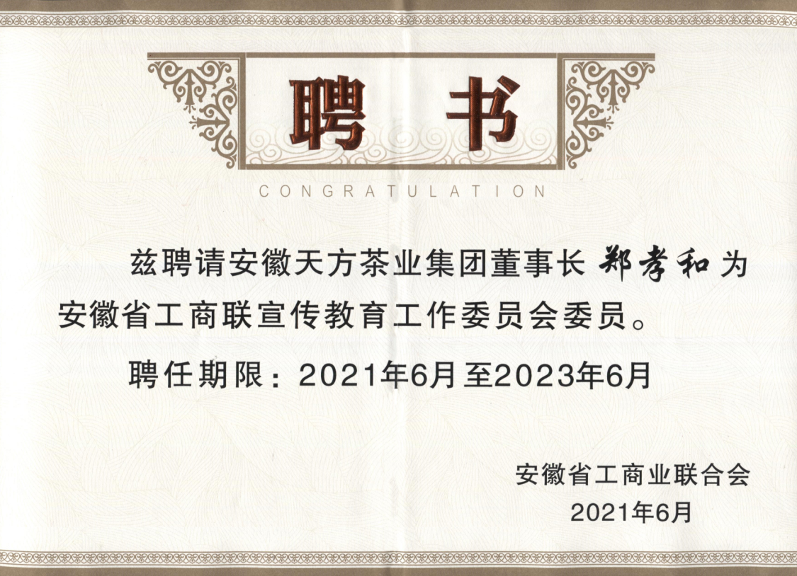 近日,安徽省工商業(yè)聯(lián)合會向天方茶業(yè)董事長鄭孝和頒發(fā)聘書,聘任鄭孝和為省工商聯(lián)宣傳教育工作委員會委員,任期兩年。