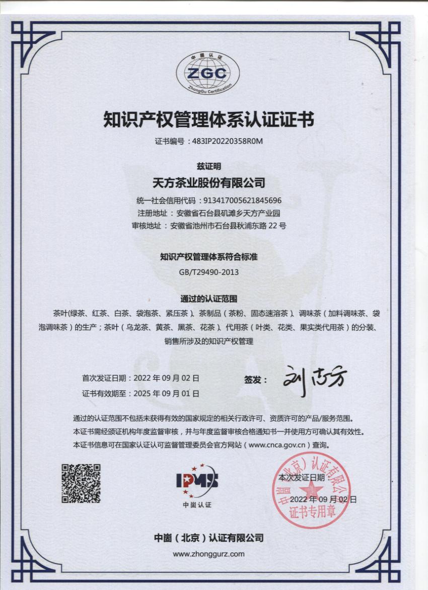 近日,天方茶業(yè)獲得知識(shí)產(chǎn)權(quán)管理體系認(rèn)證證書。